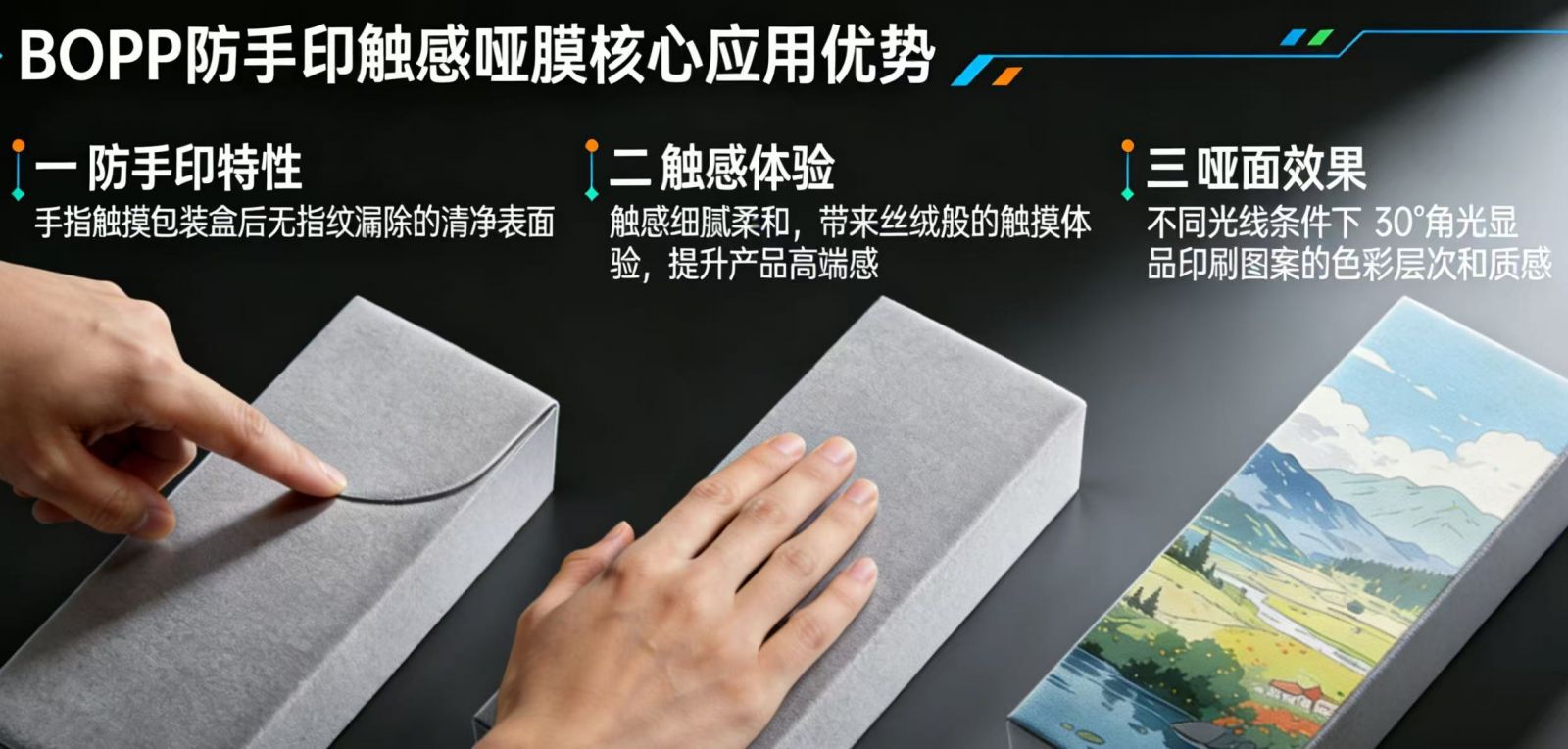 家人們誰懂啊!高檔包裝一沾指紋直接變“廉價貨”?客戶摸兩下盒面全是印子,好好的禮盒質感秒垮!今天給做包裝/做品牌的老板們,安利個能讓產品溢價翻倍的王炸材料一BOPP 防手印觸感膜!